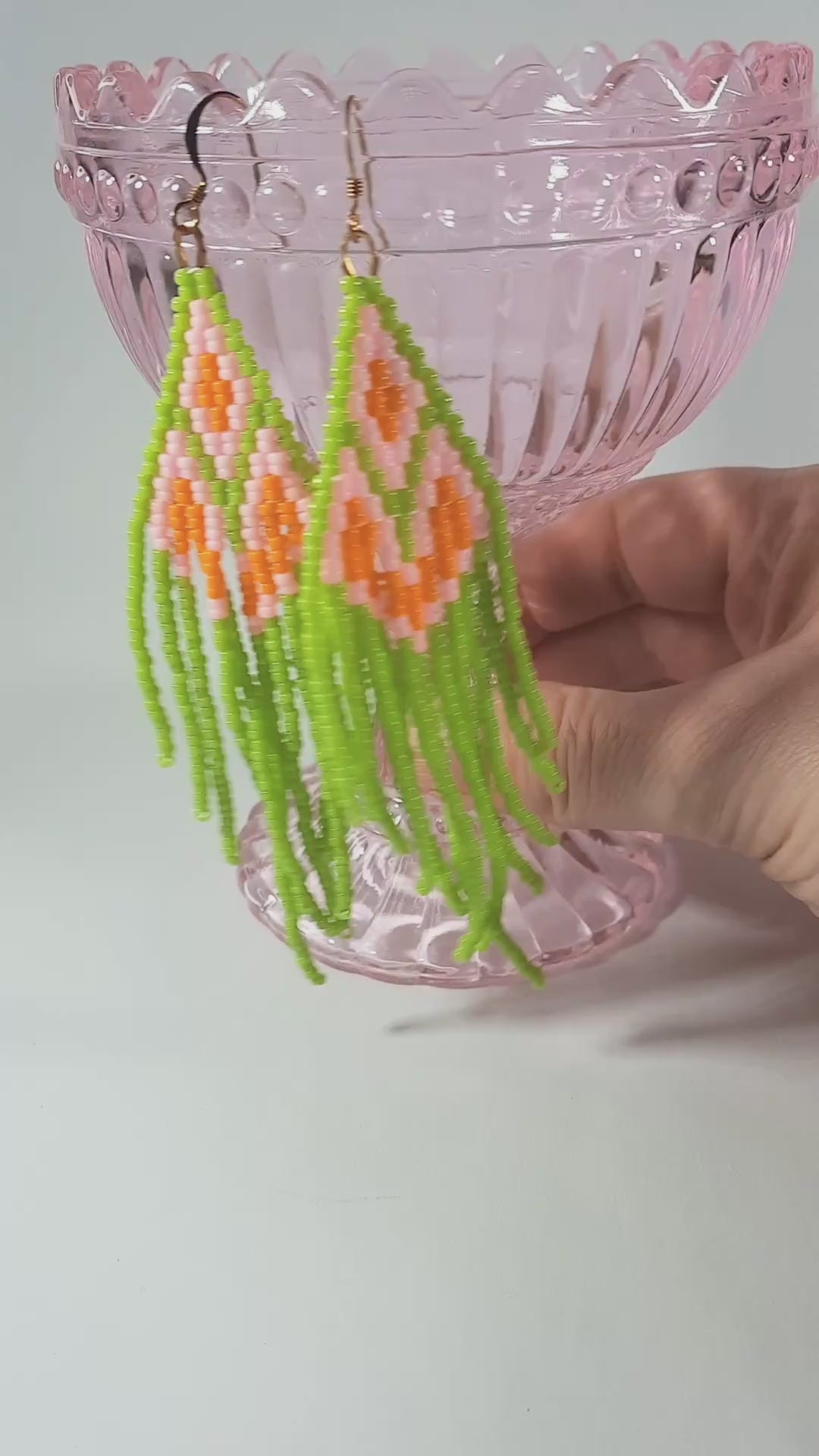 Handwoven fringe earrings made of small glass beads. Color is bright green with pink and orange. These are boho and chic style. Length with hook is about 4,7 inch (12 cm) and width is about 0,98 inch (2,5 cm). The beads that used are size of 2 mm. Hooks are jewelry metal. Nickel free. Very light to wear.